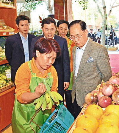 曾蔭權昨出席新生農社愉景灣分店的開幕禮,聽取職員介紹該處售賣的有機食品。 新生精神康復會10年間陸續創辦了19項多元化社會企業,包括新生農社、新生餐廳、新生便利店等,為超過500名康復者提供在職培訓和就業機會。