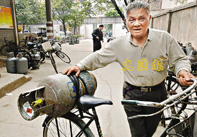 廣東液化氣價格短時間內迅速上漲,四天內由99元漲到123元的歷史高位。圖為8日,72歲的羅老伯為節約3元錢的送氣費,自己用單車運煤氣罐。 新華社