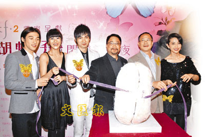 【本報訊】(記者 李慶全)《蝴蝶飛》前晚於中環IFC戲院舉行首映禮,監製徐小明、導演杜琪峰及四位主角周渝民(仔仔)、李冰冰、黃又南及閻清進行一個「愛.重生」的儀式,合力將蝴蝶蟲繭打開讓蝴蝶拍翼往上飛,寓意票房報捷。而周渝民一身白色西裝襯百萬鑽石吊鏈與身穿黑色珠片裙的李冰冰以「黑白配」亮相,相當合襯,於二人合照時,男方也很有風度,輕攬冰冰的纖腰。