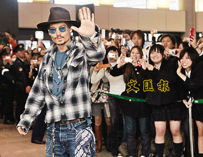 荷里活影星尊尼特普日前到達日本東京,為新戲《魔街理髮師》宣傳。他未抵步,機場上一早已經有不少影迷守候。最後,以西部牛仔形象示人的尊尼特普,面對影迷如此熱情,亦難得向影迷揮手道謝,更臉露「少少」笑容。難怪一眾女影迷顯得特別開心,並令機場頓時鎂光燈閃個不停。該套電影將會在19日於日本上映。 ■文:炸/圖:路透社