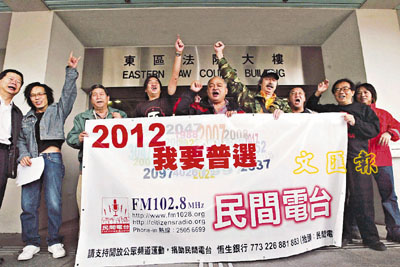 ■民間電台6人無牌廣播獲撤銷控罪時,在庭外拉標語。
