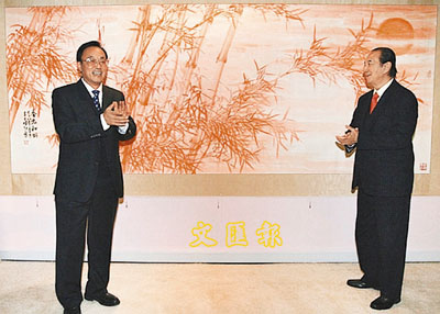 ■北京市副市長、北京奧組委執行副主席劉敬民(左)與全國政協常委何鴻燊為《春光和韻圖》揭幕。