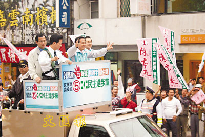 【本報訊】綜合台灣媒體9日報道:陳水扁於9日下午四點,重回2004年「三一九槍擊案」現場,稱要走完四年前未完成的掃街拜票行程,陪台南市第二選區民進黨候選人賴清德掃街拜票。而國民黨「總統」提名人馬英九晚八點也前往台南市,陪同第二選區的國民黨候選人高思博拜票。選前倒數三天,扁、馬兩人對決意味濃厚,也凸顯立委選情激烈,已經進入最後白熱化的階段。而警方如臨大敵,投入上千名警力,採取極為嚴密的保安方式。