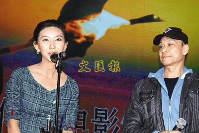 ■王學圻(右)及唐一菲笑談拍《消失的村莊》花絮。