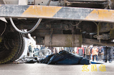 北京工程罐車鬧市區輾死騎車老太。12日,北京甘家口一輛水泥罐車在轉彎時撞倒一位騎車老太,老太被捲入卡車底盤頭部受左後輪輾壓腦漿溢出,場面慘不忍睹。中通社