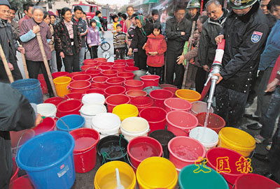 ■企業違法直接排污導致開平5萬人斷水5天,類似事件近年在佛山也發生過,因北江流域一工廠嚴重污染,三水鎮決定斷水,7萬人受到影響,圖為當地居民在消防水龍頭附近排隊接水。 資料圖片