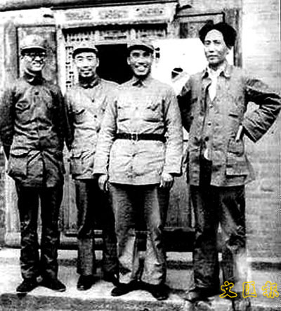 ■二戰前期,由於國民黨的經濟封鎖,朱德有感延安比往日冷清,決心重整當地經濟。圖為毛澤東(右)和朱德(右2)、周恩來(左2)等在延安。 網上圖片