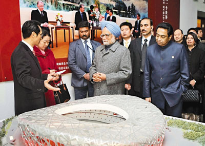 13日中午,在北京市副市長陳剛的陪同下,戴著藍色頭巾、身著一襲灰色大衣的辛格參觀了位於國家體育場附近的2008奧運工程展示中心,觀看了國家體育場「鳥巢」、國家游泳中心「水立方」等奧運場館的模型,並欣賞了介紹奧運的視頻錄影。辛格在參觀時表示,北京在籌辦奧運會過程中展現了巨大的智慧,在場館建設等方面的經驗將為印度舉辦大型賽事特別是2010年英聯邦運動會「提供靈感」。