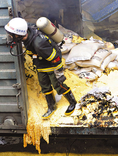 ■昆明硫酸廠發生爆炸已造成5死33傷2人失蹤。消防人員在搜救失蹤人員。 新華社