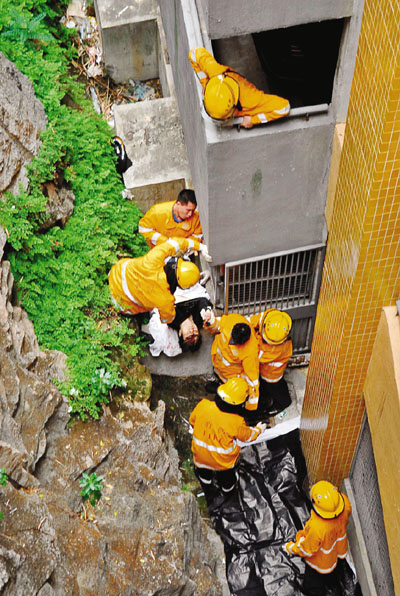 ■消防員在斜坡拯救從商場跳下輕生的男子。