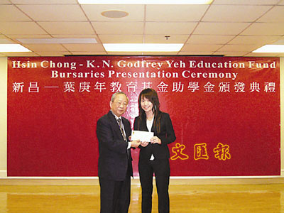 【本報訊】(記者 陳倩筠)新昌葉庚年教育基金每年均撥出助學金資助有經濟困難的學生,今學年有117名大專學生受惠,涉及107萬多元的助學金額。基金主席陳祖澤日前主持頒發典禮致辭時表示,教育基金自1980年成立至今已有27年,其間頒發的助學金總額達3,000萬元,受惠學生逾4,000人。