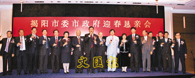 【本報訊】(記者 沈清麗)揭陽市委市政府日前假尖沙咀美麗華酒店舉行迎春懇親會,與旅港鄉親歡聚一堂,暢敘鄉情。揭陽市政協主席歐漢波代表該市600多萬市民,向旅港鄉親和廣大香港同胞致以新年最美好的祝願。