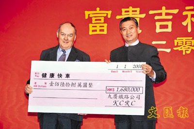 ■九廣鐵路公司總裁詹伯樂(左)致送168萬港元善款予「健康快車」香港基金理事會主席陳振彬。