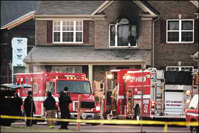 ■肇事的房屋被燒至焦黑,警方及消防員在現場調查。 網上圖片