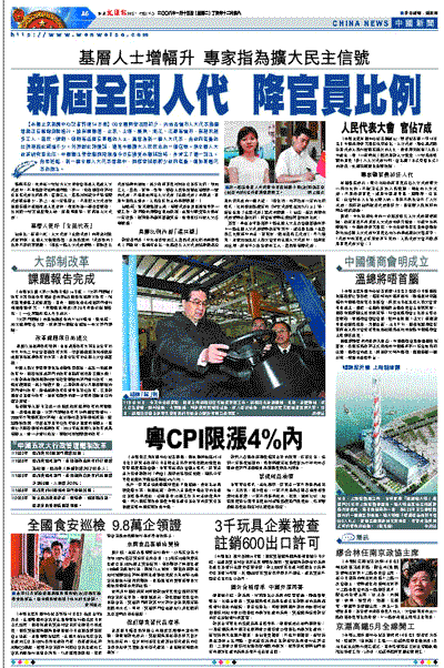 【本報北京新聞中心記者許煜14日電】08全國兩會召開前夕,內地各省市人大代表換屆選舉正在緊鑼密鼓進行。據有關報道,北京、上海、廣東、浙江、江蘇等省市,有越來越多工人、農民、律師、教師等活躍在基層的人士,當選為新一屆人大代表,而政府官員的比例卻因此減幅不少。外界對此評價說,這是中國擴大人民民主的一個信號。原全國人大政策研究室主任、中國憲法學會顧問程湘清今日在接受本報採訪時,亦肯定了這一說法。他並透露,新一屆全國人大代表選舉中,同樣會採取較少政府官員、增加基層代表的做法。