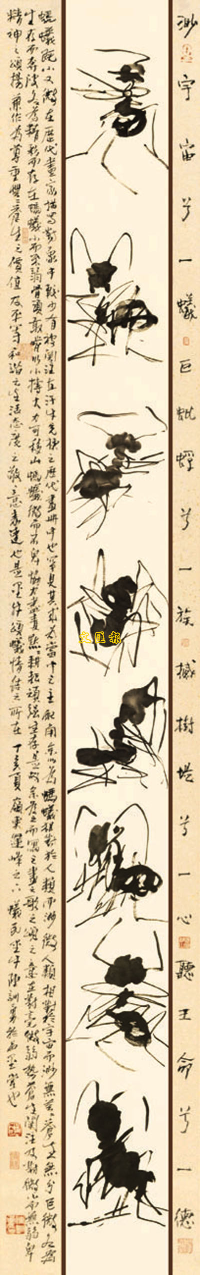 這三張畫是畫家對一揮而就的最好詮釋。陳訓勇指,他畫《八圖》的靈感說來就來,說不來就不來,畫出來以後很是喜歡,一直不敢在上面蓋印。《墨牛夢蟻》是他晚上半睡半醒時畫出來的作品,陳訓勇形容,蟻連兩個牙齒和眼睛都在睡覺。這兩張作品都被中國美術館收藏。