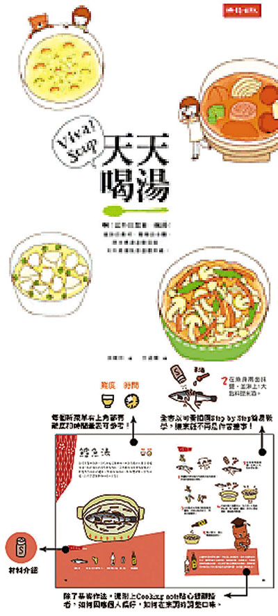 書中以淺白的字眼,配上大量手繪插圖,比一般食譜更易明白。全書共分5個章節,包括單一美味、雙享鮮美、多重滋味、小火鍋.涮涮鍋及甜果湯,由淺入深,讓你逐步掌握煮湯竅門,加上烹飪小知識,煮湯原來可以這樣有趣簡單。想看看這些煮湯食譜,可到http://www.readingtimes.com.tw/timeshtml/books/CJ0013.pdf