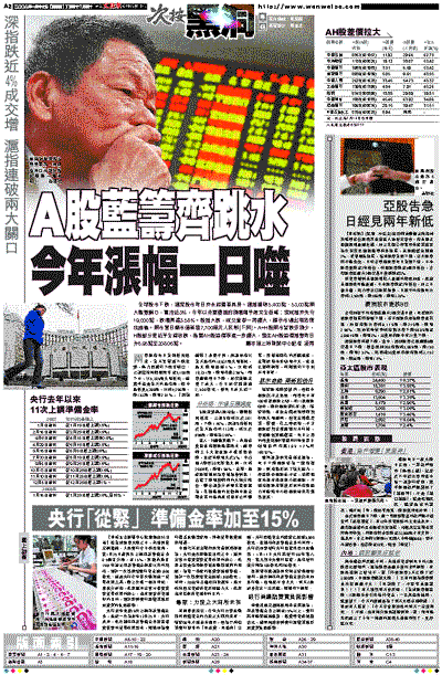 全球股市下跌,滬深股市昨日亦未能獨善其身。滬指連破5,400點、53,00點兩大整數關口,重挫近3%,今年以來累積起的漲幅幾乎被完全吞噬;深成指亦失守19,000點,跌幅高達3.58%。股指大跌,成交量卻一再擴大,顯示市場出現恐慌性拋售。兩市單日總市值蒸發7,700億元人民幣(下同)。A+H股兩市皆跌多漲少,H股部分更近乎全線收跌,拖累AH股溢價率進一步擴大,恆生AH股溢價指數昨日升6.95點至208.06點。