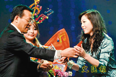 ■浙江台州市市委書記張鴻銘為蘇勒亞其其格頒發獎盃和證書。