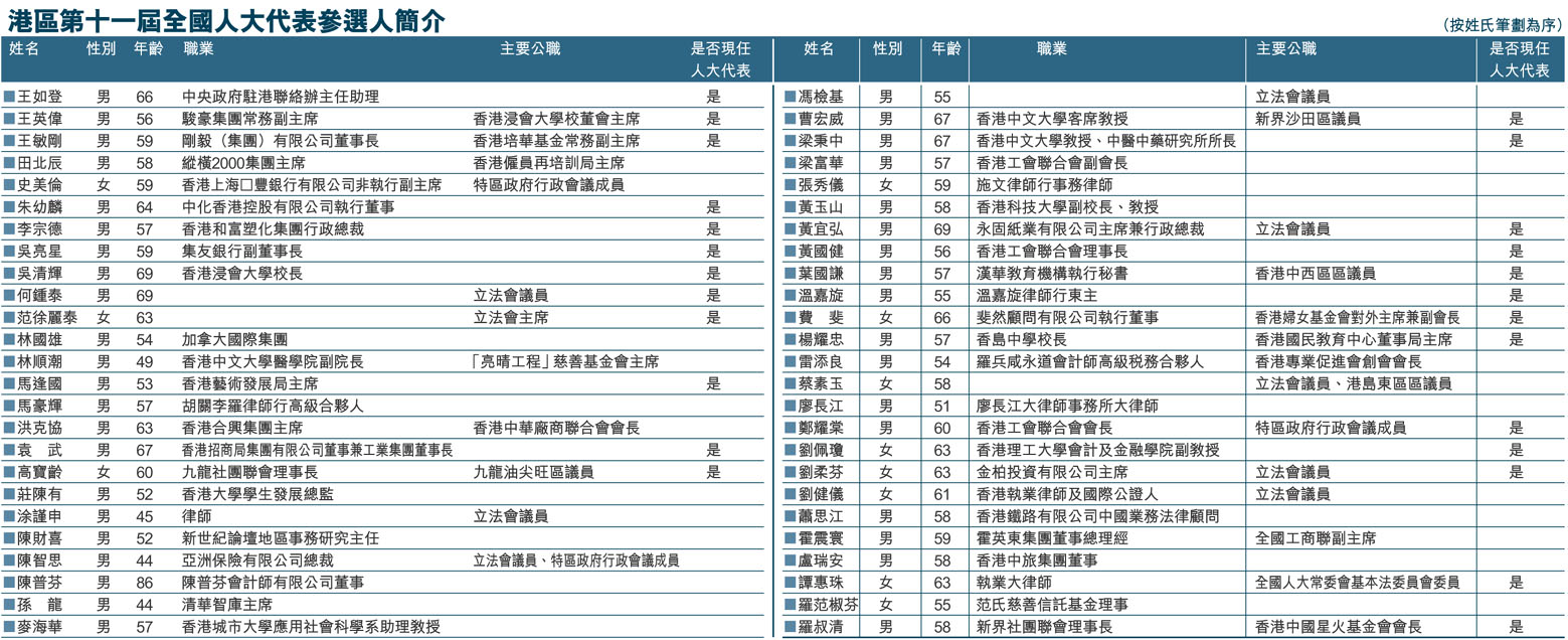 港區第十一屆全國人大代表參選人簡介 (圖)