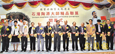 暌違16載的石灣陶源大師精品聯展,由裕華國貨董事長總經理余國春、董事副總經理余鵬春陪同主禮嘉賓:全國政協常委、北海集團主席徐展堂,廣東省政協常委梁紹棠,佛山市禪城區區長梁維東,佛山市政協常委岑傑英,富臨飯店董事總經理楊貫一,中國工藝美術大師劉澤棉、梅文鼎、黃松堅、劉炳、霍家榮,佛山市新石灣美術陶瓷廠董事長陳月華共同為展覽主持開幕剪綵。