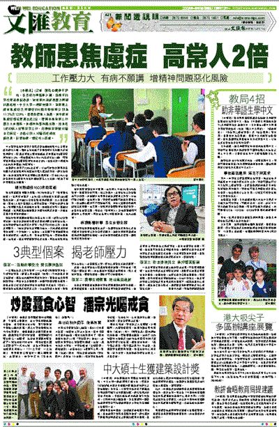 中大醫學院精神科學系教授及香港健康情緒中心主管李誠的研究小組,剛於去年完成了針對教師行業的壓力及情緒病研究,發現老師患上經常焦慮症及抑鬱症的6個月發病率達11.3%,與整體成年人的4.1%比較高出1.8倍;而教師患抑鬱症的6個月發病率亦有12.8%,也遠高於一般成年人8.3%的抑鬱症1年發病率。