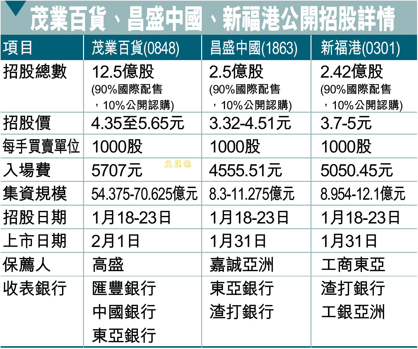茂業百貨、昌盛中國、新福港公開招股詳情 (圖)