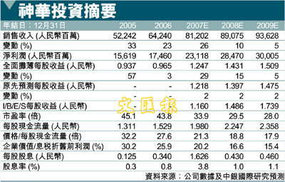 在根據公司最新公佈的經營數據調整了我們模型中的數據後,我們將神華能源(1088)07-09年的每股收益預測各上調了2%。因此,我們將目標價由49.50港幣上調至50.80港幣(昨收45.35元)。維持優於大市評級不變。