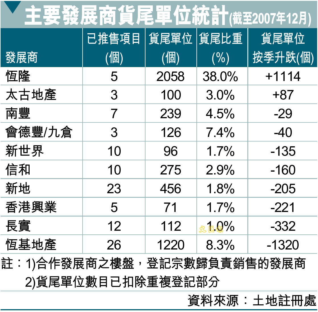 主要發展商貨尾單位統計(截至2007年12月) (圖)
