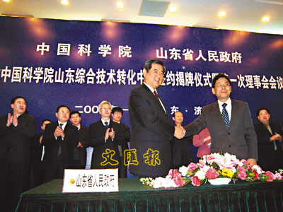 中國科學院山東綜合技術轉化中心日前正式在濟南簽約成立,該中心將針對環渤海地區區域經濟和社會發展需求,重點在先進裝備製造、信息通信技術、新材料、生物技術與製藥、現代農業、海洋技術、生態、環保與新能源等領域開展關鍵技術的推廣和科技成果轉化,提升山東省產業技術核心競爭力。根據協議,到「十一五」末,中心將力爭在山東省累計應用和轉化重大高新技術成果100項(次),累計實現社會經濟效益達到500億元人民幣。