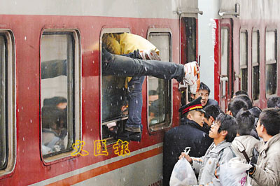 ■春運期間安徽合肥的火車站,由於人潮擁擠,乘客不得不從窗戶爬進車內。路透社