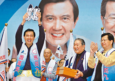 ■馬英九(左)19日參加全台體育界馬蕭後援總會成立大會。 中央社
