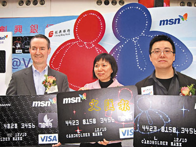 ■鄒惠玲(中)預期MSN@VISA信用卡今年可發逾萬張,旁為朱會泳(右)及VISA國際組織香港暨澳門地區總經理杜卓文。