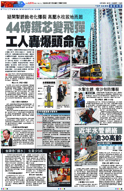 【本報訊】柴灣杏花h盛泰道發生罕見的爆水管傷人意外。兩名水務署工人,在檢查一條使用23年、懷疑滲漏的地底食水管時,鐵造的水管閘掣突然爆裂,噴出高達14層樓的高壓水柱之際,一截重達20公斤(44磅)的閘掣芯,恍如「衝天炮」般彈出,以125磅衝力擊中一名洪姓男工人的頭部,導致他即時昏迷,經送院搶救後,情況危殆;其同行的女監工,則遭碎片擊中嘴部輕傷。水務署初步不排除是水掣鏽蝕老化肇禍,已成立專責小組調查。警方與水務署暫將事件列作工業意外處理。