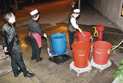 ■食肆的職員推著膠桶取水應急。本報記者溫瑞麟 攝