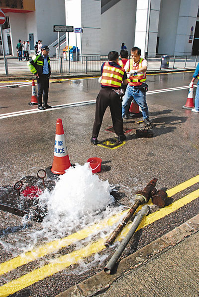 ■隨著水管老化,本港年均發生1500宗爆水管意外。圖為水務署人員正在杏花h爆水管現場關水掣。