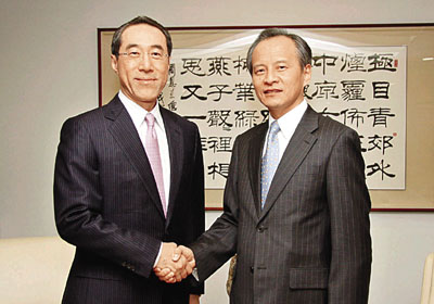 ■政務司司長唐英年昨抵日本東京,展開為期4日的訪問,此行會拜訪日本政府主要內閣官員,並與日本商界領袖和傳媒會面,介紹香港的最新發展。他亦會與當地文化機構會晤,及參觀東京中城一帶的藝術設施。在東京期間,唐英年還會出席由香港駐東京經濟貿易辦事處主辦的歲末午餐會並發表演說,並於周四返港。圖為唐英年拜會中國駐日大使崔天凱。