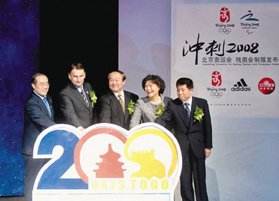 ■北京奧組委執行副主席蔣效愚(中)等嘉賓啟動倒數200天儀式。新華社
