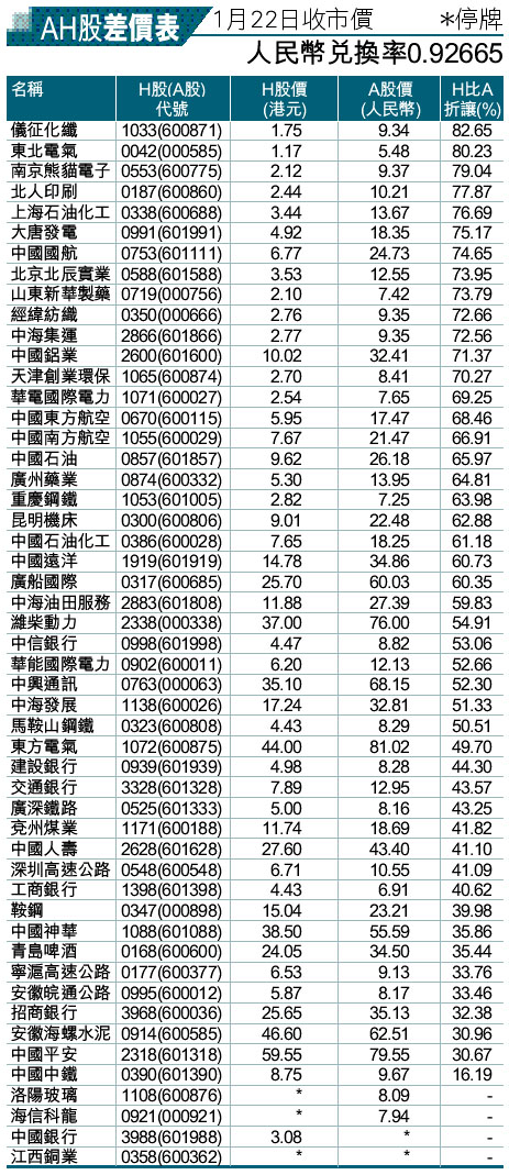AH股差價表(1月22日收市價 *停牌 人民幣兌換率0.92665)