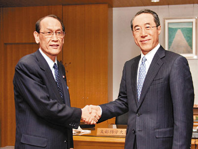 ■政務司司長唐英年(右)昨拜會日本文部科學大臣渡海紀三朗。