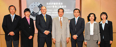 由左起:陳作基博士(香港總商會工業及科技委員會主席),余麗姚(香港零售管理協會執行總監),顏啟榮(商界環保協會常務總裁)、潘宗光教授, GBS, JP(最終評審委員會主席、香港理工大學校長),馮永業(香港生產力促進局總裁),鍾惠霞(香港科技園公司企業拓展及科技支援高級經理),戴淑嬈(工業貿易署助理署長)(非評審委員會成員)