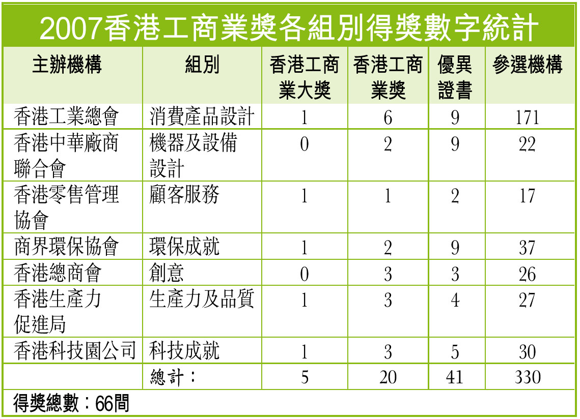 2007香港工商業獎各組別得獎數字統計 (2008-01-24) (圖)