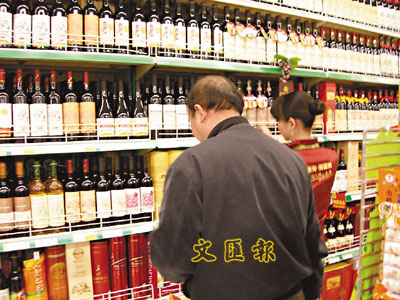 ■年關近,食品、酒類等消費猛增。圖為顧客在深圳的超市選購瓶酒。 本報記者李昌鴻 攝