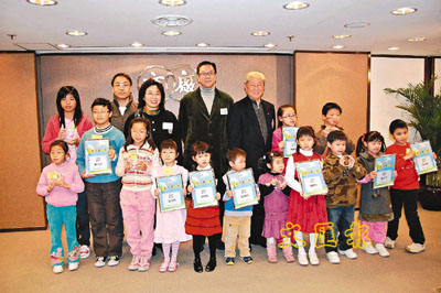 ■施榮懷(後排左四)、會董李漢忠(後排左五)與兒童繪畫比賽評判及得獎者合照。