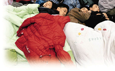 ■坐困數日,幾名旅客乾脆在車站大廳內合被而睡。 本報記者鄭海龍 攝
