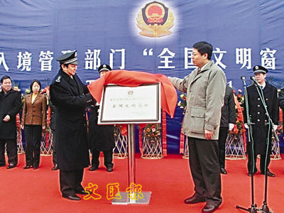 石家莊市公安局出入境管理處被公安部授予「全國文明窗口」稱號,日前舉行了揭牌儀式(見圖)。2007年1月1日石家莊成為河北省首個辦理居民赴港澳個人遊城市。據石家莊市公安局出入境管理處負責人楊素金介紹,去年該處共受理出國申請28649人次,赴港澳申請21661人次;辦理外國人簽證622人次,居留許可635人次,台灣居民簽注103人。石家莊市公安局投入170萬元用於新辦證大廳建設,接待大廳面積為420平方米,日接待量可達500餘人,是過去的三倍。 ■本報駐河北記者 梁利崢