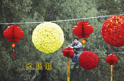 ■農曆鼠年將至,一個工人掛起高高的大紅燈籠,為北京的地壇公園粉飾一番。路透社