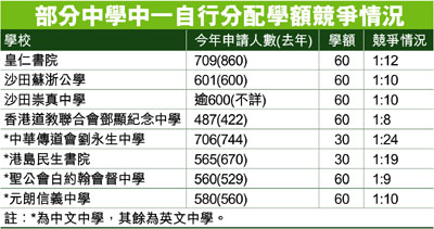 傳統名校在升中上競爭非常激烈,不過,因升中學生人口減少帶來的影響他們亦難以倖免,報讀人數急跌。去年有860人申請的皇仁書院,今年只收到709份報名表,大跌近2成,競爭情況也由去年14人爭1位,變成12人爭1位。