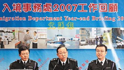 ■入境處處長黎棟國(中)引述醫管局數據,稱自限制內地孕婦新政策後,內地孕婦經急症室入院分娩數目驟減。本報記者梁祖彝 攝
