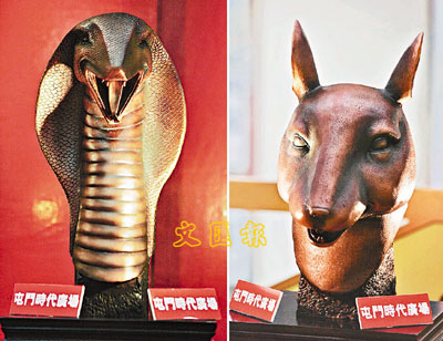 【本報訊】圓明園的十二生肖青銅獸首像,每次在拍賣會出現都必掀高潮。屯門時代廣場由即日起,舉行「圓明園十二生肖青銅獸首像展」,現場放置了由江蘇國家級雕塑大師製造、仿照十二生肖青銅獸首像的銅像,供市民參觀。 本報記者高仲明 攝